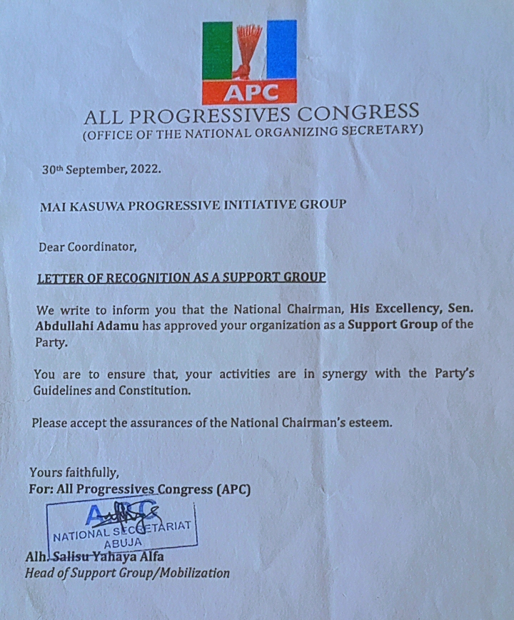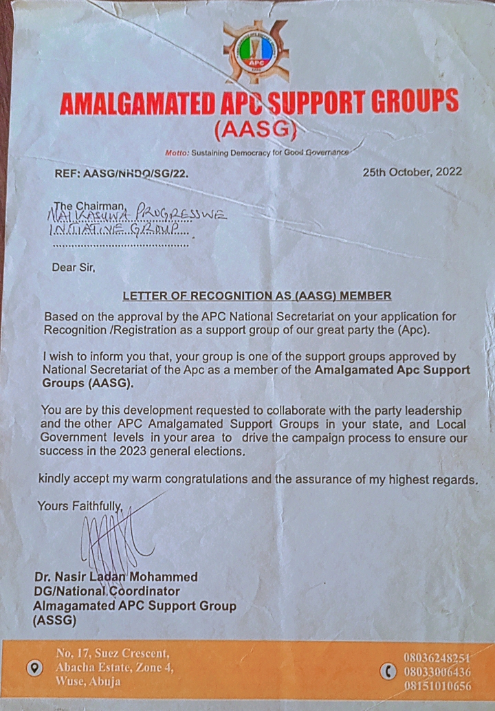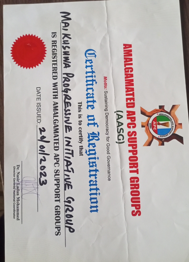 View CertificateOfficial recognition of Mai Kasuwa Progressive Initiative Group as a support group of the APC.